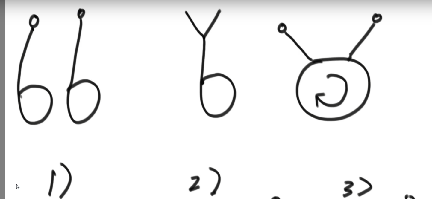 - 思路2:(不采用哈希表的方法,需要先判断两者有没有环,满足题目要求的方法)情况1:如果两个链表都没有环;先遍历两个链表,并记录两个链表的length;两者都走到最后之后,直接判断两个链表最后的节点内存地址是不是相同,相同说明相交,继续走,不同则不相交,返回;相交的话,先让长的那个链表先走diffLength步(因为不可能在长链表的前差值步内相交,不然短的不够长);然后两个链表同时往下走,直到节点内存地址相同,即是相交点。情况2:如果一个有环一个无环,两者不可能相交(这是单链表,只有一个next)。情况3:两个都有环,会有如下三种子情况:对于子情况2,可以直接按照两个无环链表找相交的问题来处理(需要把入环节点视为终点),对于子情况1和3,找到两个链表的入环节点loop1和loop2,loop2不动,让loop1往下走,如果遇到了loop2,就是子情况1,返回Null;若遇到了loop2,就是子情况2,返回loop1或者loop2都可以。