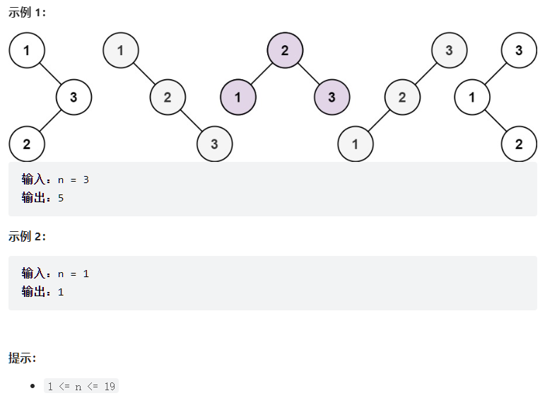 给你一个整数 n ,求恰由 n 个节点组成且节点值从 1 到 n 互不相同的 二叉搜索树 有多少种?返回满足题意的二叉搜索树的种数。