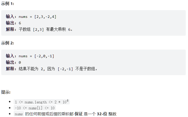 给你一个整数数组 nums ,请你找出数组中乘积最大的非空连续子数组(该子数组中至少包含一个数字),并返回该子数组所对应的乘积。