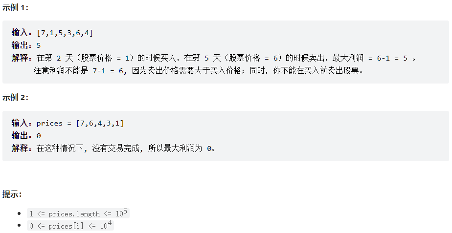 你只能选择 某一天 买入这只股票,并选择在 未来的某一个不同的日子 卖出该股票。设计一个算法来计算你所能获取的最大利润。