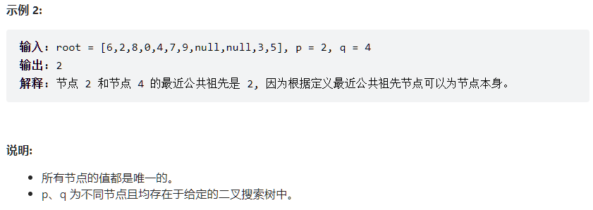 - 如果root等于其中一个值,则公共祖先一定是root,因为在二叉搜索树中,dfs的顺序一定会先找到大的那个,则小的那个一定在下面。 题解: