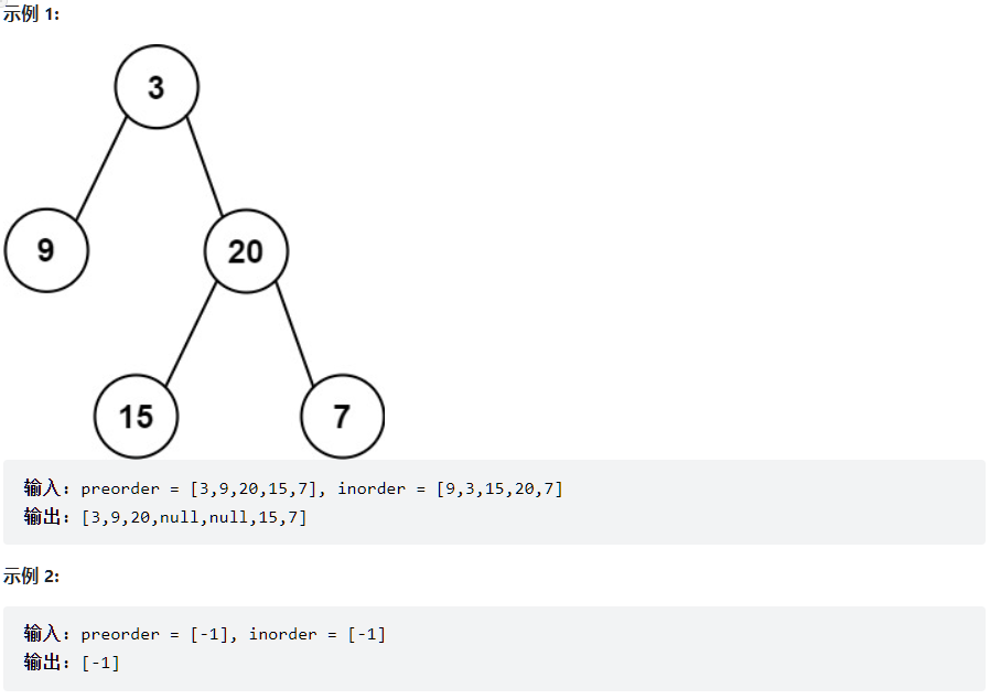 1 <= preorder.length <= 3000inorder.length == preorder.length-3000 <= preorder[i], inorder[i] <= 3000preorder和inorder均 无重复 元素inorder均出现在preorderpreorder保证为二叉树的前序遍历序列inorder保证 为二叉树的中序遍历序列