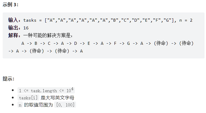 给你一个用字符数组 tasks 表示的 CPU 需要执行的任务列表。其中每个字母表示一种不同种类的任务。任务可以以任意顺序执行,并且每个任务都可以在 1 个单位时间内执行完。在任何一个单位时间,CPU 可以完成一个任务,或者处于待命状态。