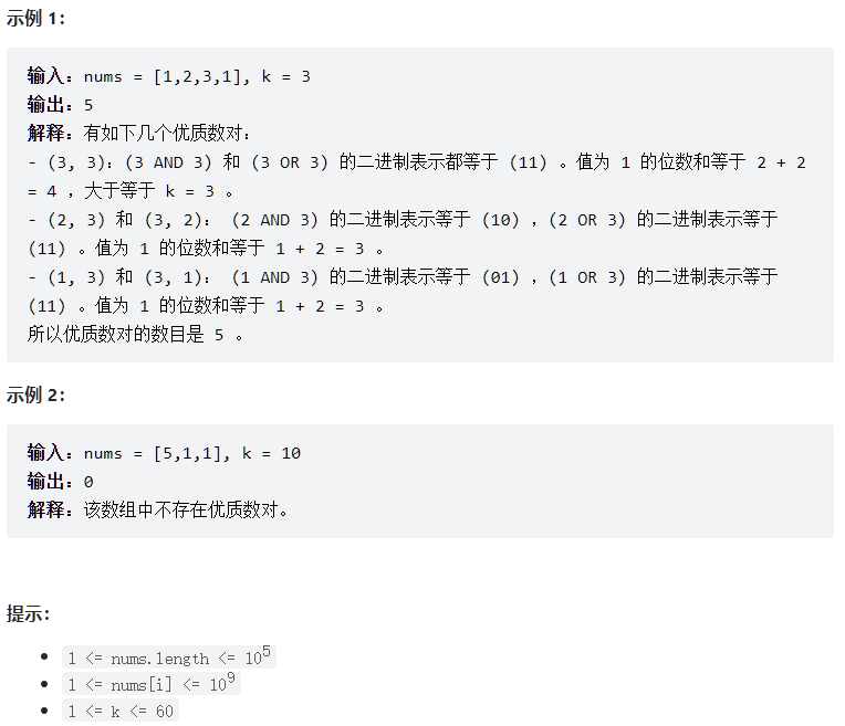 num1和num2都 在数组nums中存在。num1 OR num2和num1 AND num2的二进制表示中值为1的位数之和大于等于k,其中OR是按位或操作,而AND是按位与操作。