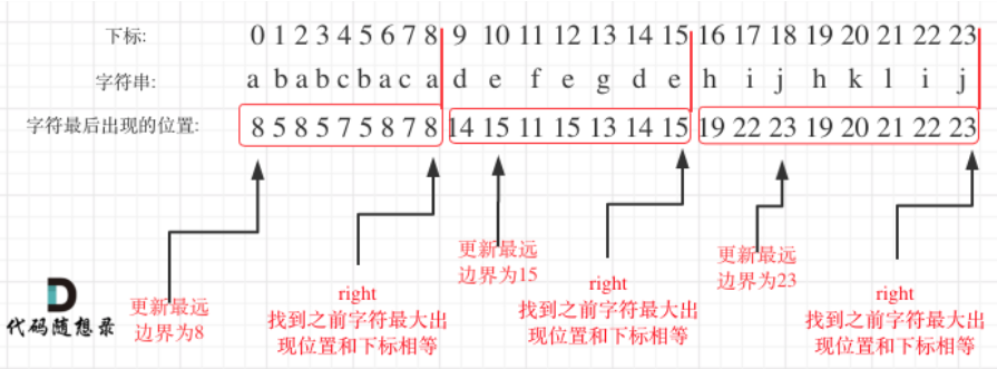 如果找到之前遍历过的所有字母的最远边界,说明这个边界就是分割点了。 此时前面出现过所有字母,最远也就到这个边界了。