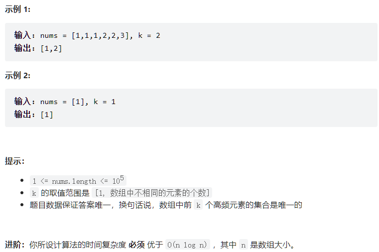 给你一个整数数组 nums 和一个整数 k ,请你返回其中出现频率前 k 高的元素。你可以按 任意顺序 返回答案。
