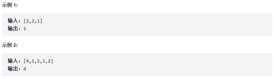 给定一个非空整数数组,除了某个元素只出现一次以外,其余每个元素均出现两次。找出那个只出现了一次的元素。