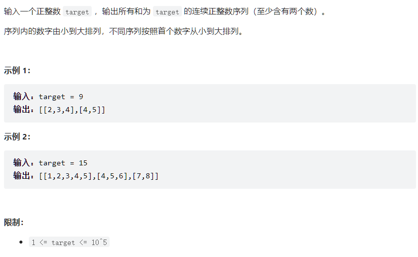 Leetcode Link: 剑指 Offer 57 - II. 和为s的连续正数序列 - 力扣(LeetCode)