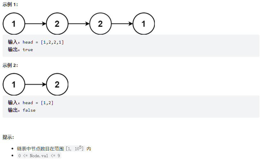 给你一个单链表的头节点 head ,请你判断该链表是否为回文链表。如果是,返回 true ;否则,返回 false 。