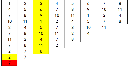 - 编号 7 的人开始重新报数,这时候我们可以认为编号 7 这个人是队伍的头。第三轮被杀掉的是编号 9 的人。