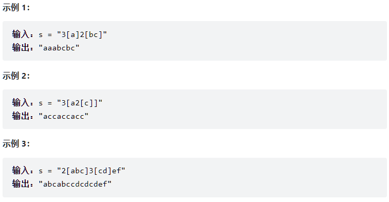 abc3[def], 当遇到第一个左括号的时候,压入栈中的是("abc", 3), 然后遍历括号里面的字符串def, 当遇到右括号的时候, 从栈里面弹出一个元素(s1, n1), 得到新的字符串为s1+n1*"def", 也就是abcdefdefdef。对于括号里面嵌套的情况也是同样处理方式。 - 凡是遇到左括号就进行压栈处理,遇到右括号就弹出栈,栈中记录的元素很重要。