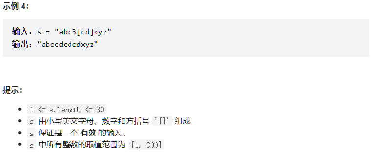 此外,你可以认为原始数据不包含数字,所有的数字只表示重复的次数 k ,例如不会出现像 3a 或 2[4] 的输入。