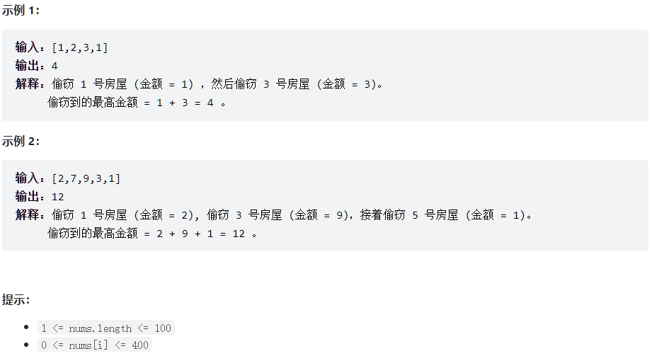 给定一个代表每个房屋存放金额的非负整数数组,计算你 不触动警报装置的情况下 ,一夜之内能够偷窃到的最高金额。