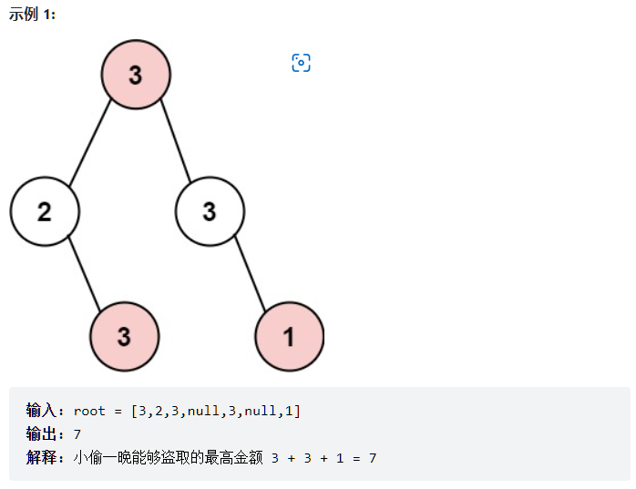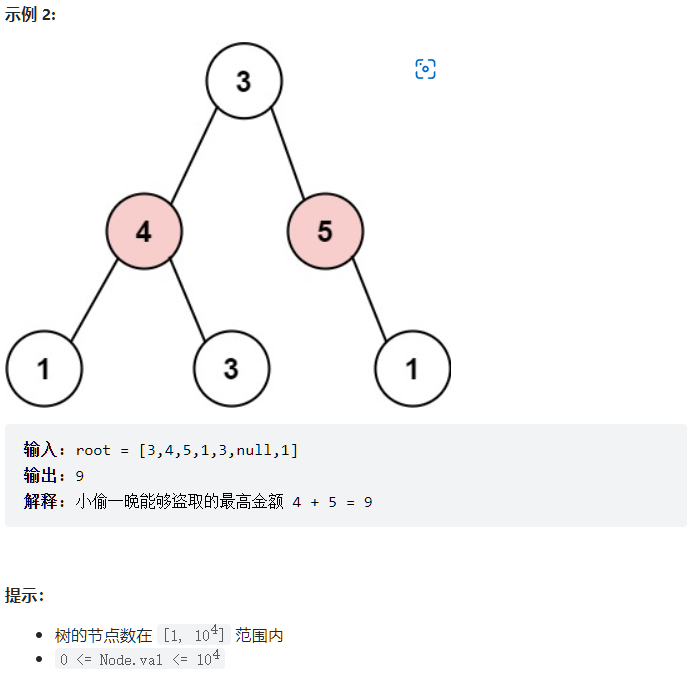除了 root 之外,每栋房子有且只有一个“父“房子与之相连。一番侦察之后,聪明的小偷意识到“这个地方的所有房屋的排列类似于一棵二叉树”。如果 两个直接相连的房子在同一天晚上被打劫 ,房屋将自动报警。