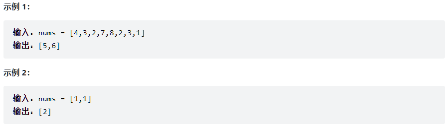 给你一个含 n 个整数的数组 nums ,其中 nums[i] 在区间 [1, n] 内。请你找出所有在 [1, n] 范围内但没有出现在 nums 中的数字,并以数组的形式返回结果。