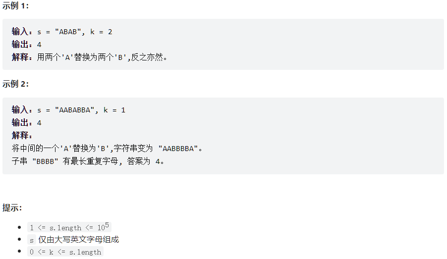 Leetcode Link: 424. 替换后的最长重复字符 - 力扣(LeetCode) (leetcode-cn.com)