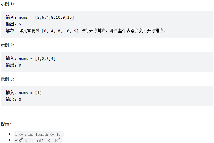 给你一个整数数组 nums ,你需要找出一个 连续子数组 ,如果对这个子数组进行升序排序,那么整个数组都会变为升序排序。