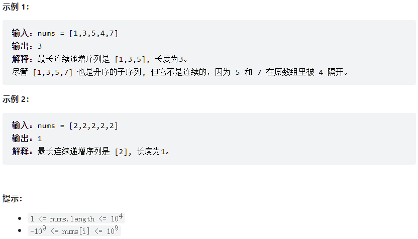 连续递增的子序列 可以由两个下标 l 和 r(l < r)确定,如果对于每个 l <= i < r,都有 nums[i] < nums[i + 1] ,那么子序列 [nums[l], nums[l + 1], ..., nums[r - 1], nums[r]] 就是连续递增子序列。