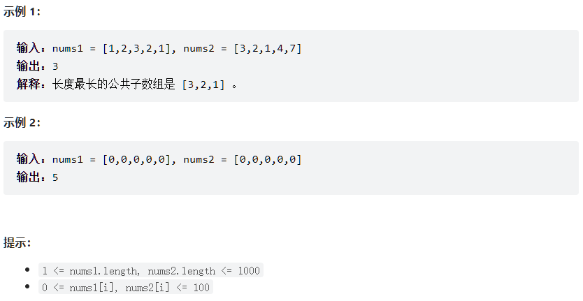 给两个整数数组 nums1 和 nums2 ,返回 两个数组中 公共的 、长度最长的子数组的长度。