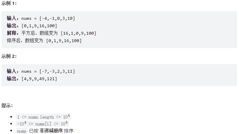 给你一个按 非递减顺序 排序的整数数组 nums,返回 每个数字的平方 组成的新数组,要求也按 非递减顺序 排序。