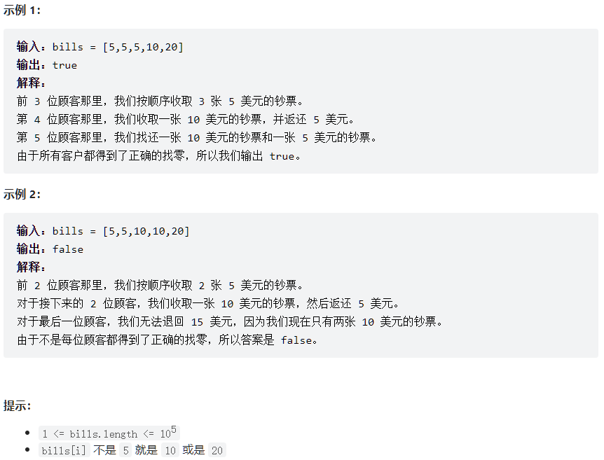 给你一个整数数组 bills ,其中 bills[i] 是第 i 位顾客付的账。如果你能给每位顾客正确找零,返回 true ,否则返回 false 。