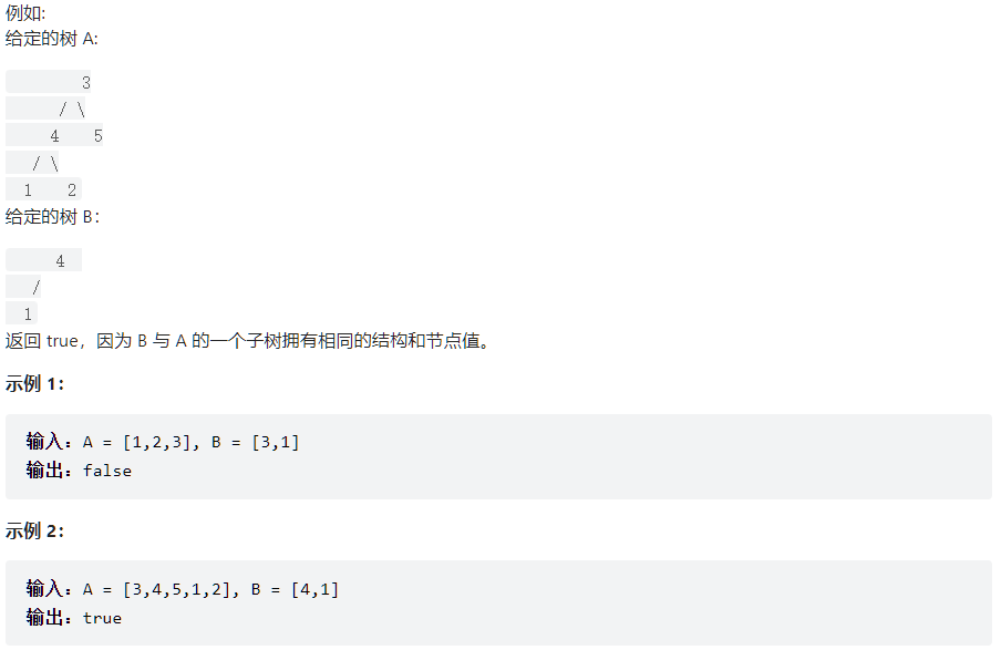 B 是 A 的子结构,即 A 中有出现和 B 相同的结构和节点值。