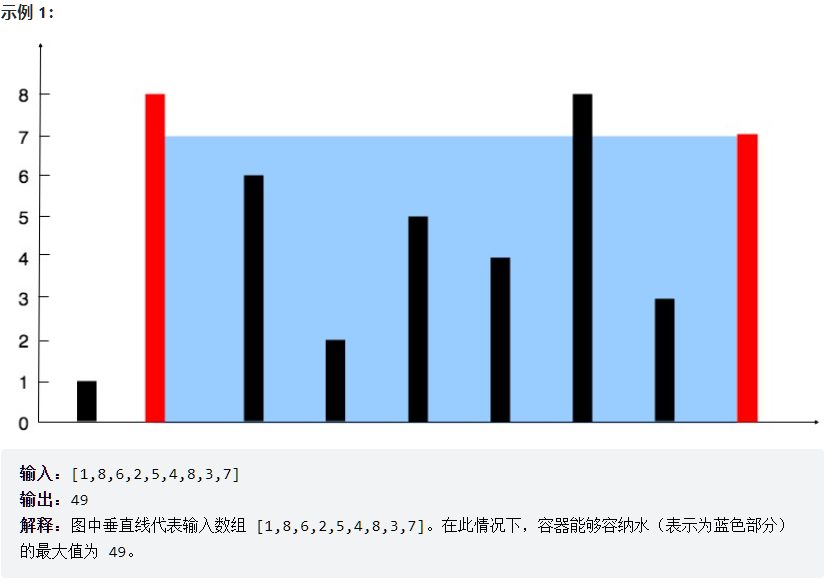 找出其中的两条线,使得它们与 x 轴共同构成的容器可以容纳最多的水。