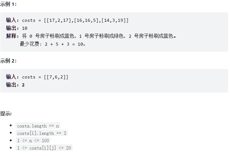 例如,costs[0][0] 表示第 0 号房子粉刷成红色的成本花费;costs[1][2] 表示第 1 号房子粉刷成绿色的花费,以此类推。