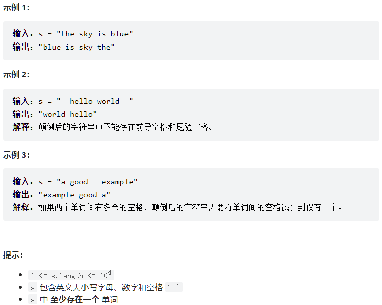 注意:输入字符串 s中可能会存在前导空格、尾随空格或者单词间的多个空格。返回的结果字符串中,单词间应当仅用单个空格分隔,且不包含任何额外的空格。