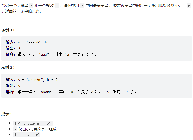 Leetcode Link: 395. 至少有 K 个重复字符的最长子串 - 力扣(LeetCode)