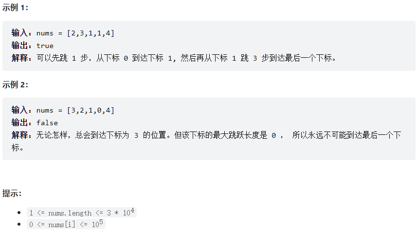 - 数组中的每个元素代表你在该位置可以跳跃的最大长度,表示我走