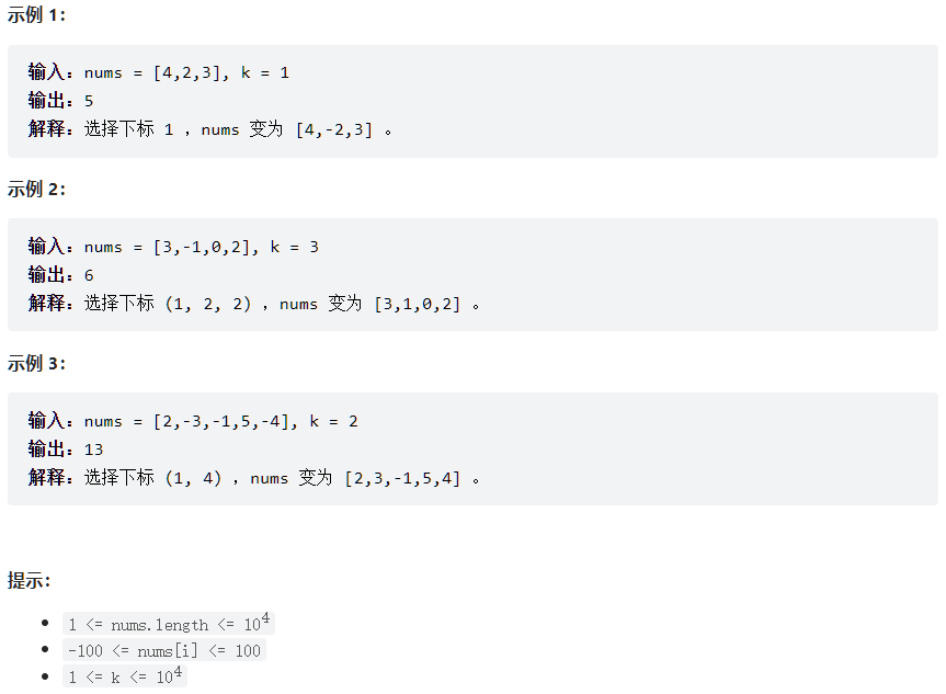 给你一个整数数组 nums 和一个整数 k ,按以下方法修改该数组: