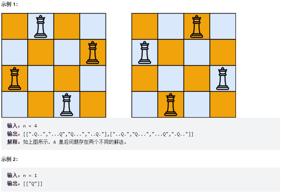 每一种解法包含一个不同的 n 皇后问题 的棋子放置方案,该方案中 'Q' 和 '.' 分别代表了皇后和空位。