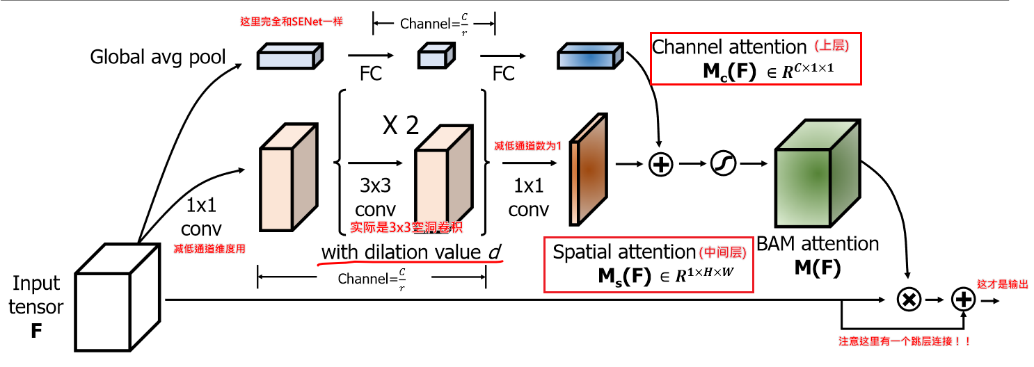 channel attention module:同 SENet 差不多,但是先 avgpooling, 然后两层全链接,然后再接一个 BN,无激活函数