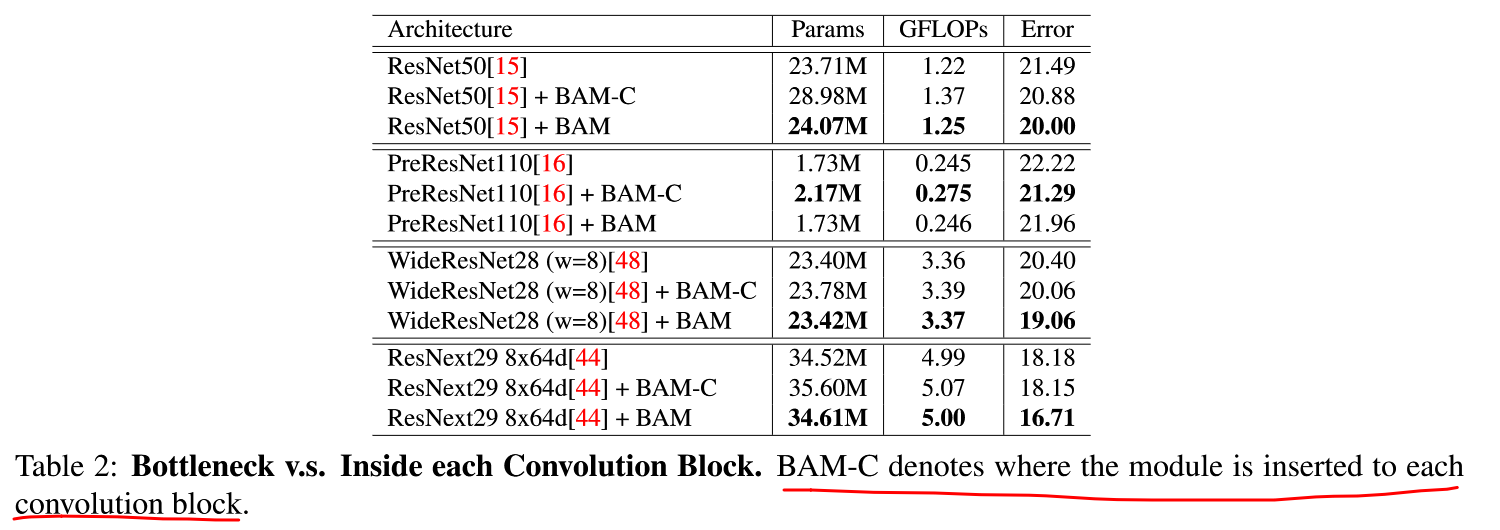 BAM 放置于瓶颈的位置效果最好,同时作者证明了这种效果的提升并不是由于深度的加深而导致的。