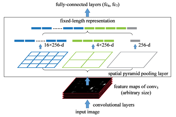 - 再对各个候选框对应的 feature maps 区域采用金字塔空间池化(SSP),提取出固定长度的特征向量。